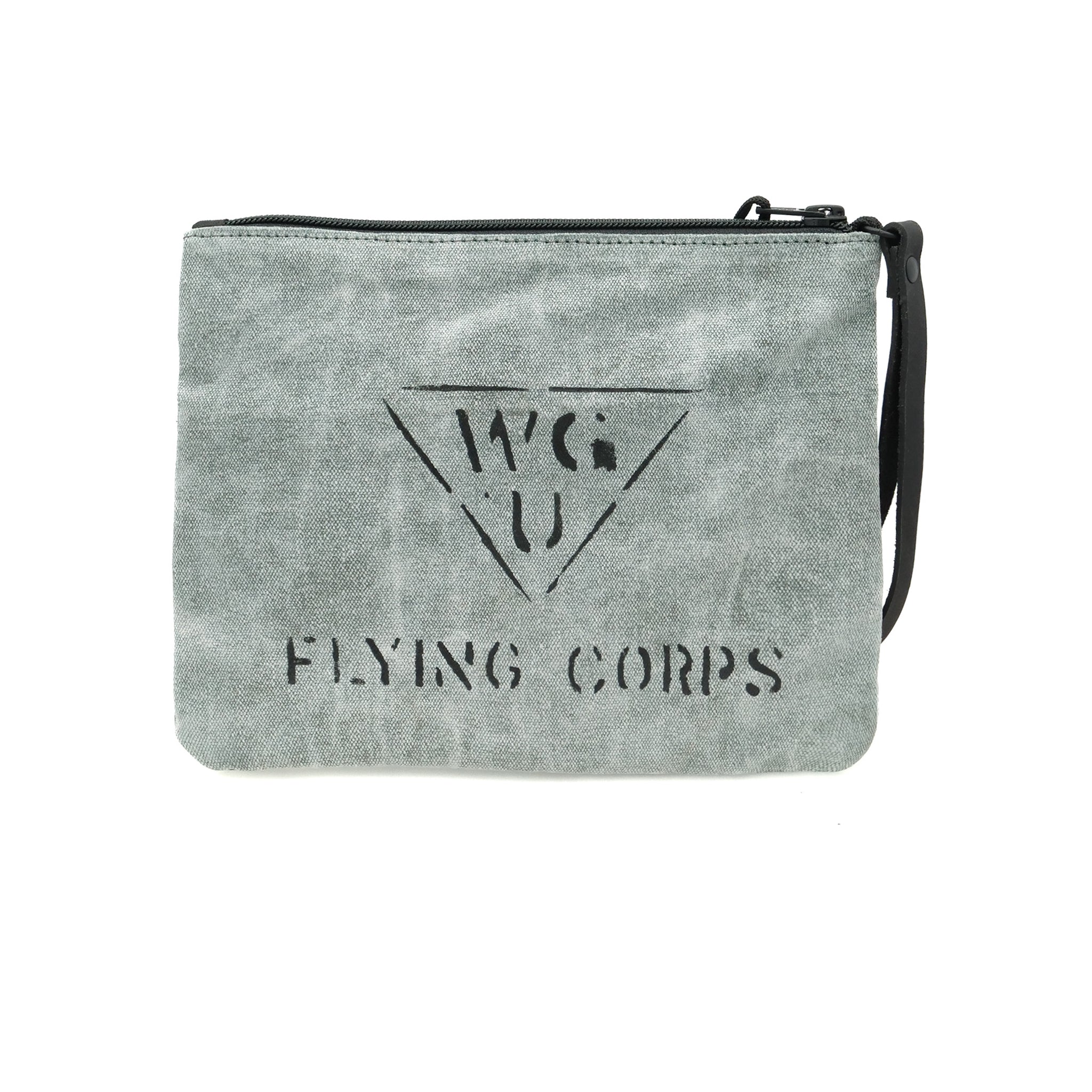 The Roger Pouch Large carries the same DNA of endurance as the gear it was born from. Crafted from heavy reclaimed military tarpaulins, each pouch shows the honest wear of service — creases, shade shifts, and hand-stitched repairs. The WG kangaroo insignia fronts it, while the WGU Flying Corps stencil on the back nods to field aviation heritage. A full-length zip, inner divider and leather wrist strap make it ideal for documents, devices, or travel essentials. Every pouch is one of one — imperfect, practical, and made to last.